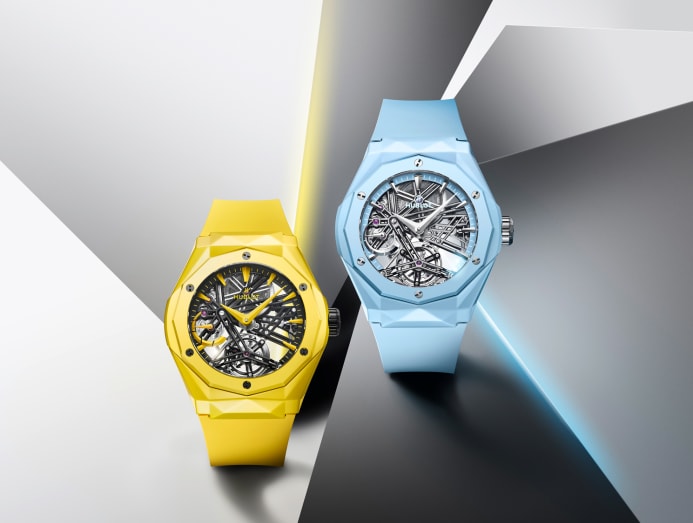 From left: Gerald Genta's Mickey Mouse Minute Repeater and Hublot's Classic Fusion Tourbillon Orlinski in sky blue. (Photos: Gerald Genta and Hublot)