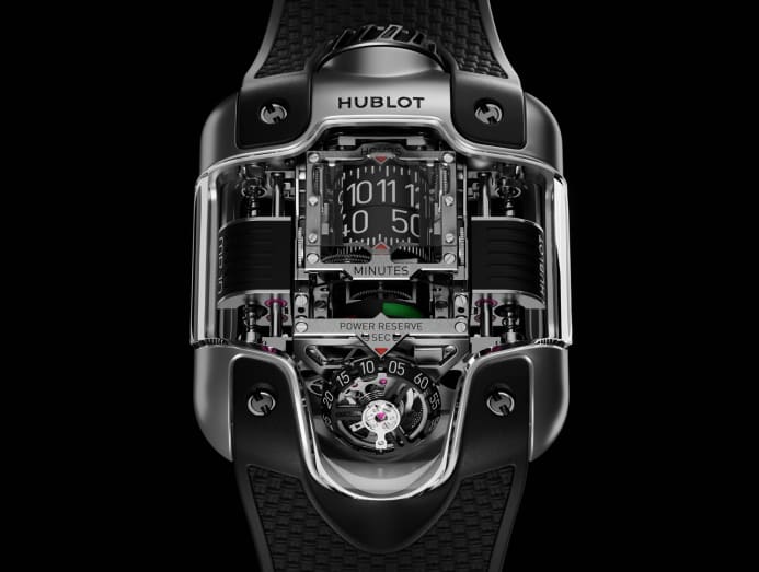 Although complex in looks, the 50-piece limited edition MP-10 is read easily and naturally from top to bottom. Sharing the same white lacquer typography on black aluminium rollers, each indication tells the current time via a red triangular marker. For the winding system, instead of a flat oscillating weight that is used in a conventional automatic watch, Hublot engineers devised the ingenious verticalised HUB9013 movement to fit into the MP-10’s unique construction. Here, it incorporates two blocks of white gold arranged on a vertical axis along which they are free to move. And while the 22.4mm-thick case construction is simple (comprising the middle and caseback in shiny micro-blasted titanium), the sapphire crystal is Hublot's most complex to date as it combines inclined planes on three axes.