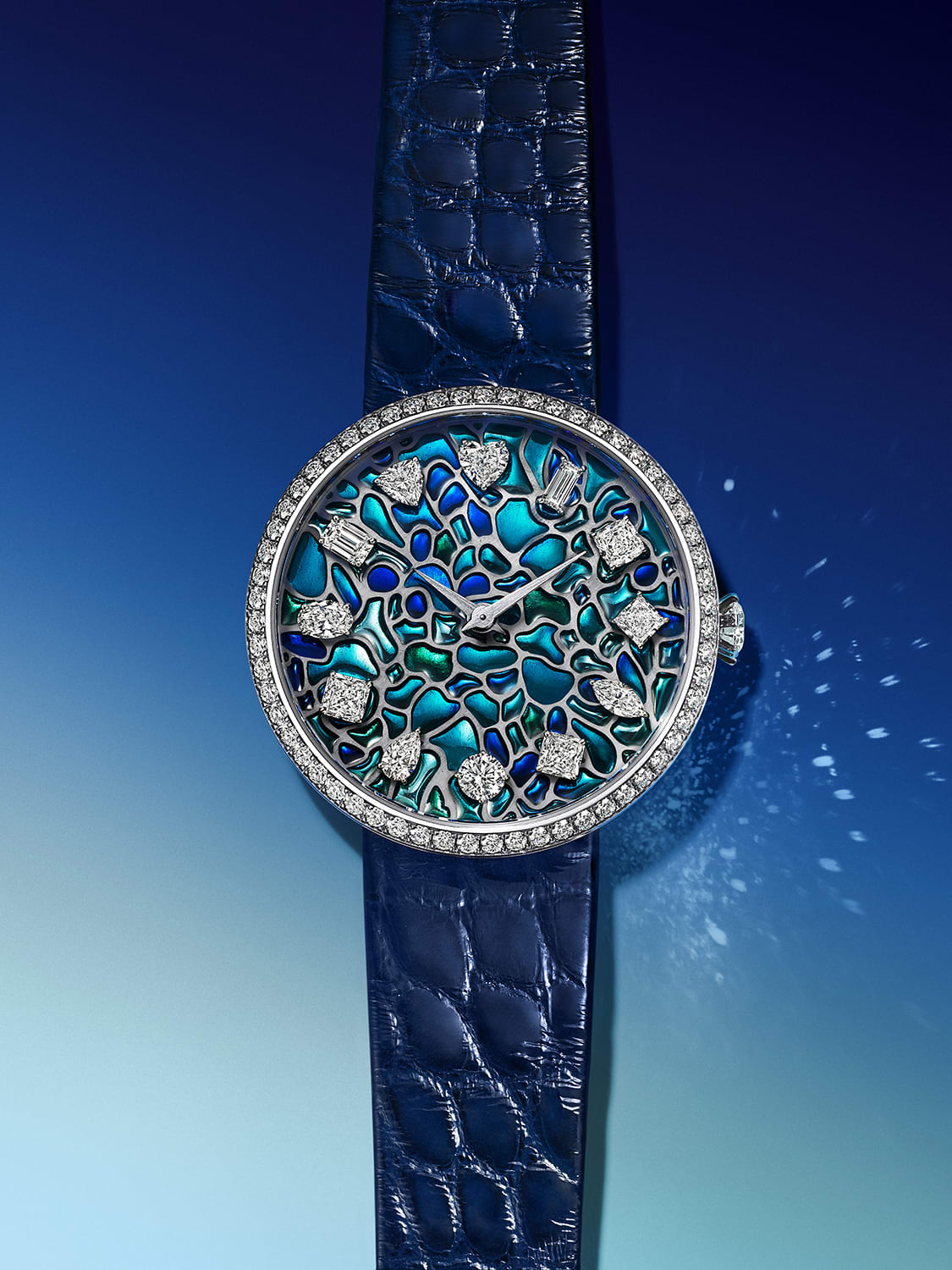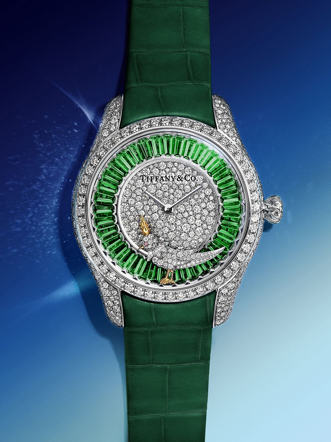 Further expanding the house’s legendary Bird on a Rock collection, Tiffany unveiled the Bird on a Rock Tsavorite. Boasting a striking contrast of icy diamonds and deep green tsavorites, the phenomenal timepiece features 36 baguette tsavorites invisibly set on a rotating ring, and a hand-sculpted, diamond-studded bird perched on the dial.