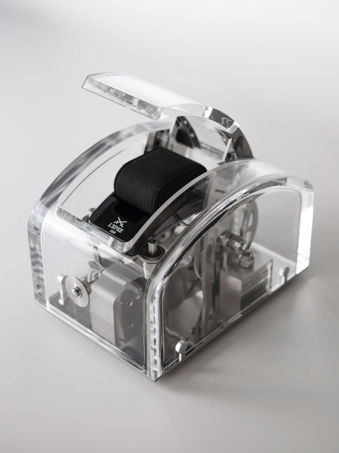 Also making its debut at LVMH Watch Week, L’Epee 1839 unveiled the Watch Box. Encased in transparent acrylic glass, this mechanical timepiece case is not just a storage solution, but an interactive experience designed to celebrate watchmaking artistry. At the heart of the Watch Box lies a meticulously engineered mechanical lift system. With a press of a button, the watch is gracefully raised as the cover opens, creating an unveiling that’s dramatic and elegant all at once. When closed, the case rewinds its internal mechanism automatically.