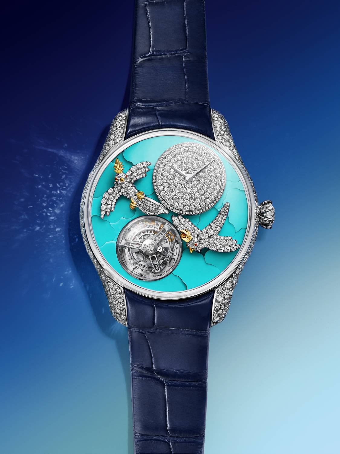 The American jeweller made a stunning debut with five timepieces. Leading the showcase was the Jean Schlumberger by Tiffany Bird on a Flying Tourbillon festooned with 848 round brilliant diamonds totalling 4 carats. Inspired by the iconic Bird on a Rock brooch, this 25-piece limited edition features a dial of turquoise marquetry, adorned with diamond-set birds in flight beneath a faceted sapphire crystal dome – a world-first in watchmaking. Powering this spectacular display is the bespoke calibre AFT24T01, developed in collaboration with Swiss haute horlogerie manufacture Artime.