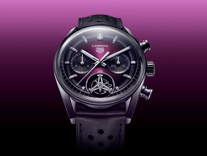 Adding sophisticated flair are Tag Heuer’s 39mm Carrera Chronograph and 42mm Carrera Chronograph Tourbillon, all dressed in an alluring smoky black-to-purple gradient dial. These timepieces also bring a new level of depth and elegance to the Glassbox design.