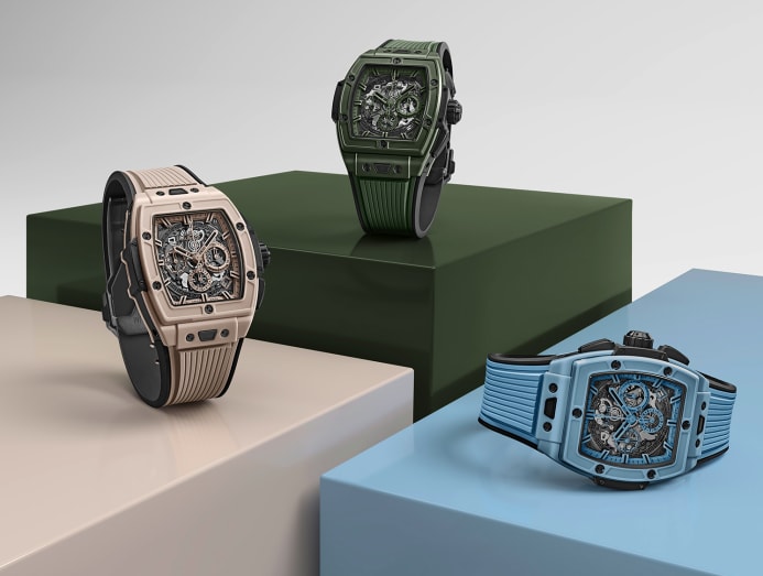 Rounding out the lineup, the Spirit of Big Bang Chronograph arrives in three fresh ceramic shades of Dark Green, Sand Beige, and Sky Blue, each a limited edition of 200 pieces. Powered by the HUB4700 movement, the 42mm model features an openworked dial and colour-matched rubber straps.