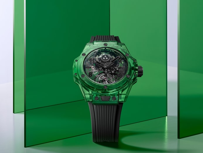 Fans will be delighted with the new Big Bang Tourbillon Automatic Green SAXEM. Hublot is the first and only watch brand to use SAXEM (Sapphire Aluminium oXide and rare Earth Mineral), a material originally designed for satellite technology, and this 44mm model boasts a striking emerald-green transparent case that gleams like a gemstone. Limited to 18 pieces, it houses Hublot’s MHUB6035 automatic tourbillon manufacture calibre, complete with a 22k gold micro-rotor on the dial side and a three-day power reserve. With an openworked movement, Super-LumiNova numerals, and a matching green rubber strap, this is an ultra-modern statement timepiece for the discerning collector.