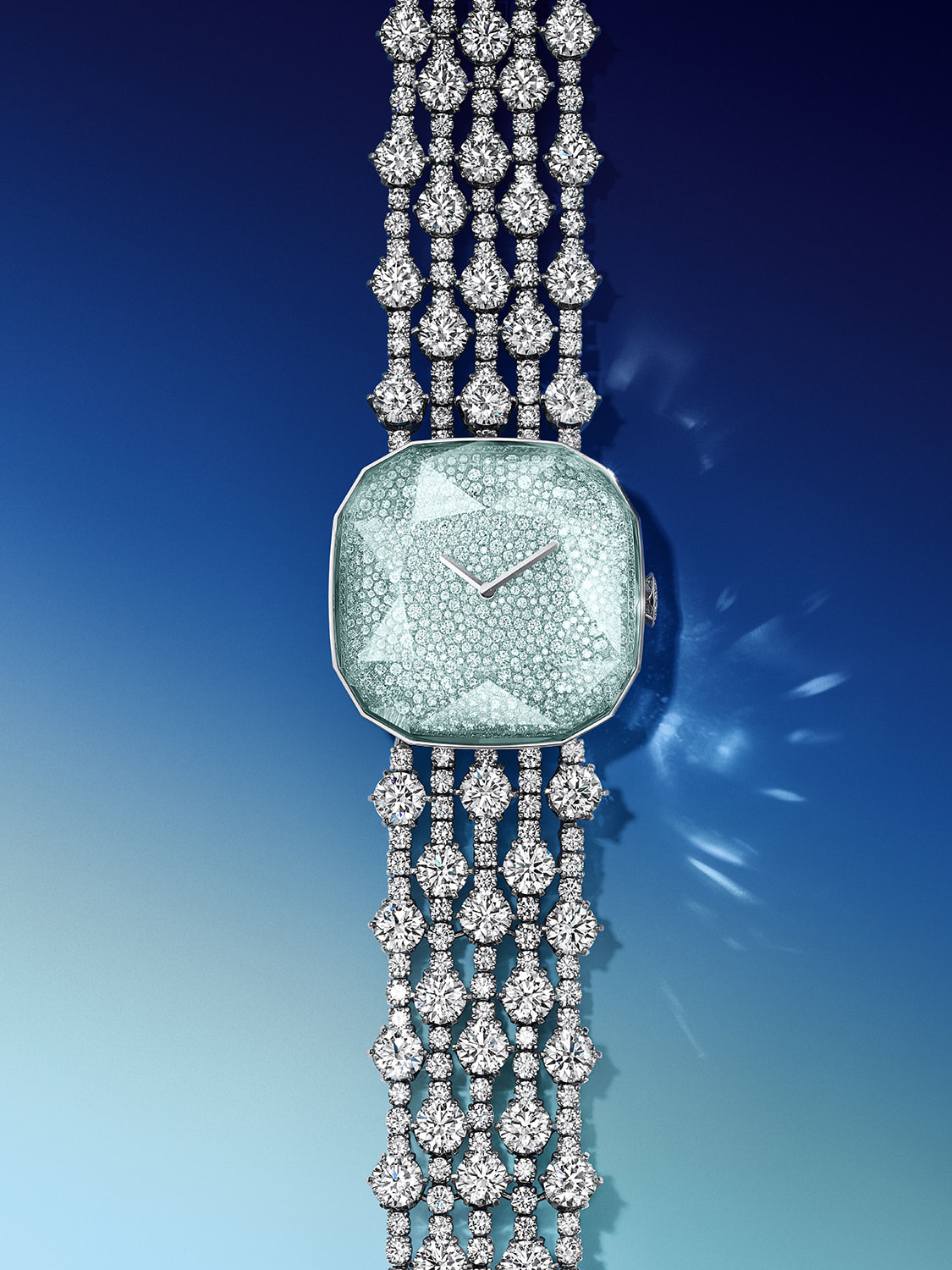 Tiffany also presented the Carat 128 Aquamarine and Eternity by Tiffany Wisteria. A one-of-a-kind creation, the Carat 128 Aquamarine showcases a 34.52-carat diamond-cut aquamarine crystal that mimics the facets of the legendary 128.54-carat Tiffany Diamond. It features 897 diamonds totalling over 29 carats, meticulously set on a white gold case and bracelet.
