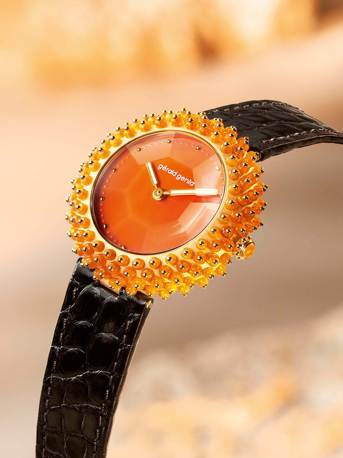 One of the crowd favourites at LVMH Watch Week, the Gentissima Oursin Fire Opal is the latest addition to the Gentissima Oursin (French for sea urchin) series that’s known for its bold, avant-garde aesthetics. This fourth iteration features a 36mm yellow gold case with 137 fiery opals – mineraloids forged in Mexican volcanoes – screwed individually into the case by a yellow gold pin. The vibrant orange cornelian dial provides an exquisite contrast, while subtle octagonal motifs are incorporated into the faceted sapphire crystal – Mr Genta’s signature shape. Driving this remarkable creation is the GG-005 Zenith Elite movement with a yellow gold oscillating mass.