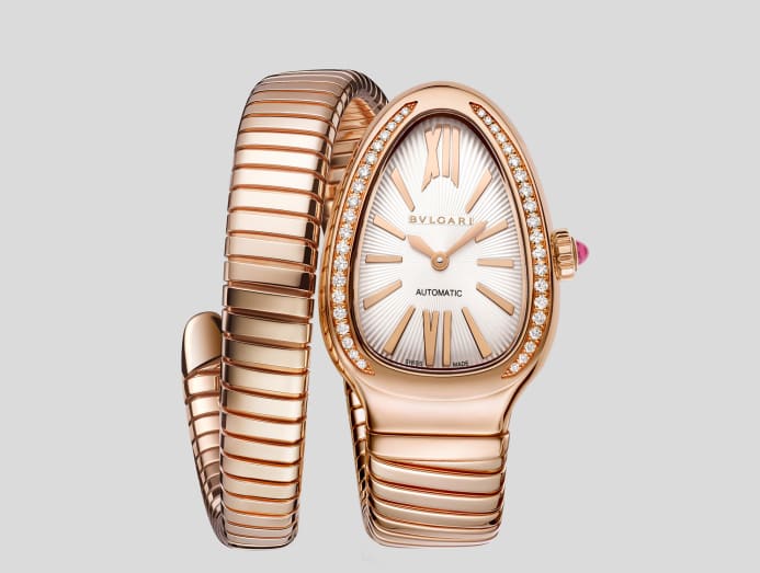 The 35mm Serpenti Tubogas Automatic in rose gold is available in single or double twirl variations, while the 34mm Serpenti Seduttori line sees seven new automatic references, ranging from full stainless steel, yellow or rose gold models with diamond-set bezels to a bicolour stainless steel and rose gold version with black lacquered or white opaline dials. For those after something glitzy, there are white or yellow gold models fully paved with 875 diamonds across the case, dial, and bracelet.