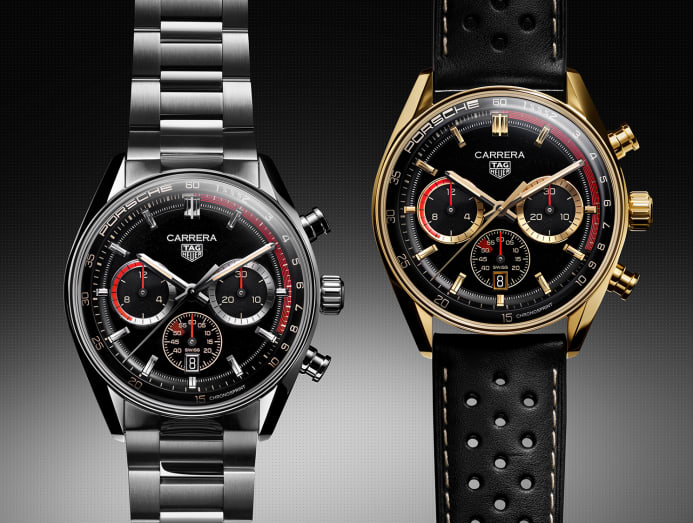 Next, the Carrera Chronosprint x Porsche Rallye honours Tag Heuer and Porsche’s shared history in motorsport, taking inspiration from vintage Heuer dashboard timers in the Monte Carlo Rally. There are two 42mm variations: A 911-piece limited edition in steel – a tribute to the Porsche 911, and a yellow gold version with only11 pieces available.