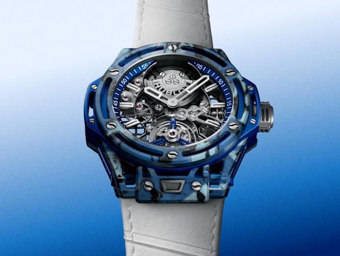 The 42mm Spirit of Big Bang Titanium Coal Blue uses the same geometric dial and houses the high-frequency HUB4700 skeleton chronograph movement with a 50-hour power reserve. Its barrel-shaped case brings the Coal Blue look to the Spirit of Big Bang silhouette.