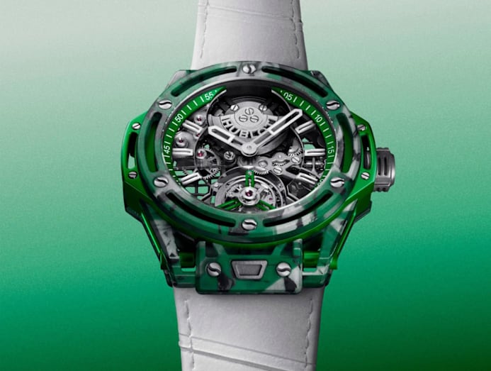 This collection comes in three colourways inspired by tennis surfaces, with quantities tied to Djokovic’s wins: 72 in blue for hard courts, 21 in orange for clay and eight in green for grass. The watches are numbered but not limited, and Hublot says it will add a new watch in the corresponding colour with each future Djokovic victory.