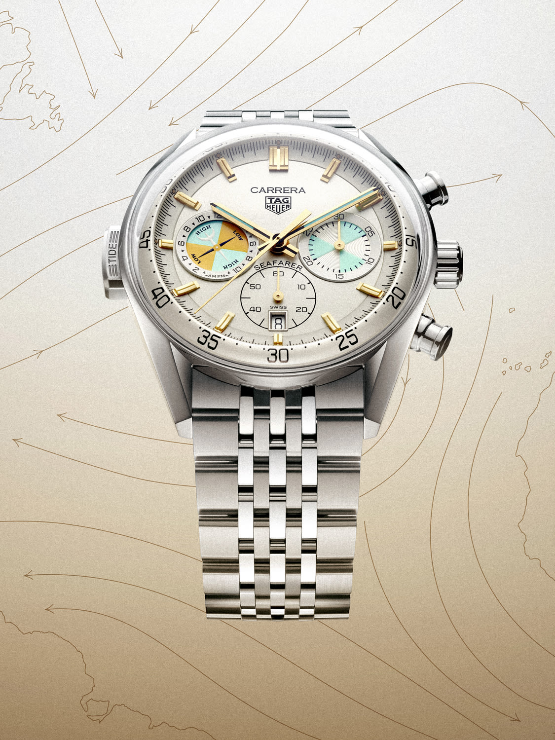 The Carrera Chronograph Seafarer nods to Tag Heuer’s maritime past with a tide display that tracks high and low tides for a specific location. The idea dates to 1949, when Abercrombie & Fitch president Walter Haynes commissioned the watchmaker to refine a tide-indicator watch for the retailer. Sold at the New York store to sailors and outdoorsmen, it even drew input from a young Jack Heuer, who asked his school physics teacher to improve the gear-ratio calculations for better accuracy.