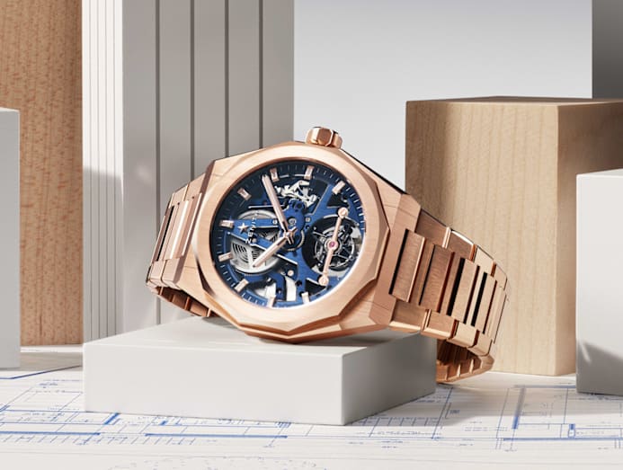 The Defy Skyline Tourbillon Skeleton is Zenith’s first skeletonised tourbillon in the Defy Skyline collection. The openworked movement sits in a 41mm rose gold case, whose faceted surfaces catch the light as the watch moves.