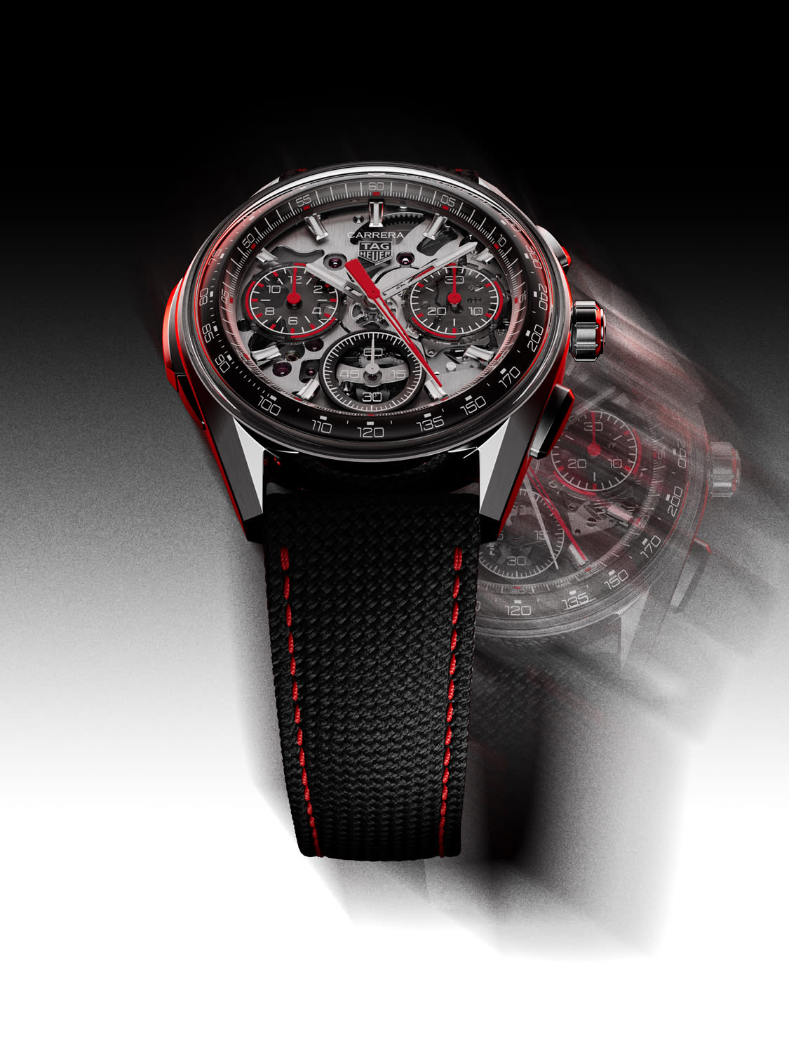 The hand-finished movement comprises over 350 components, beats at 5Hz and delivers a 65-hour power reserve. It’s finished with Tag Heuer’s hand-engraved chequered flag motif and more than 10 finishing techniques.