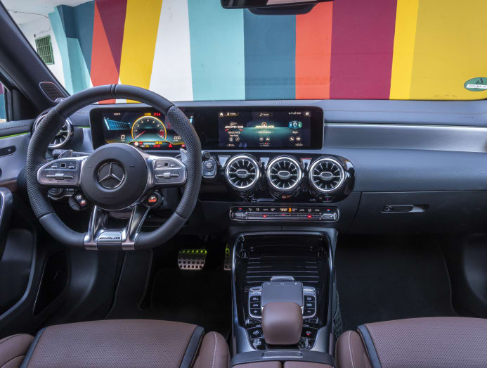 The CLA45 also has a model-specific steering wheel with configurable “ears” (to turn off the stability control, open up the exhaust flaps, among other things) and a rotary dial to control the driving modes. In the A35, you’ll have to make do with the controls mounted on the centre console next to the infotainment system’s touchpad.