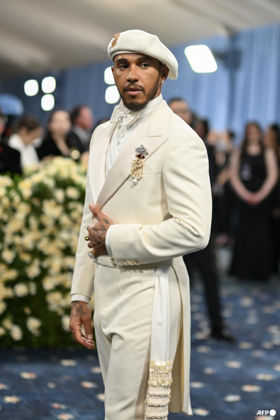 The F1 driver, one of the co-chairs of this year’s event, wore an ivory suit with matching beret by Wales Bonner.