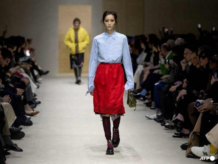 Models present creations of the Prada collection at the end of a fashion show as part of the Milan Fashion Week Womens-Mens collection Fall-Winter 2026-2027, in Milan on February 26, 2026. (Photo: Miguel Medina/AFP)