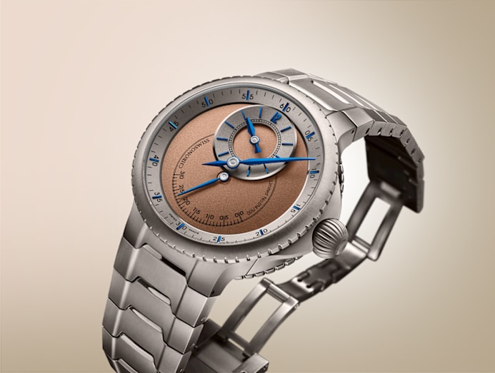 The new Pulse One collection, however, marks its boldest departure yet. It’s the brand’s first integrated-bracelet sports watch thanks to the trend’s seemingly inexhaustible mileage. Crafted entirely from titanium, the Pulse One Sand pairs a sandblasted brown dial with blued hands and hour markers, all while keeping the distinctive regulator layout and retrograde seconds. Beneath it beats the automatic Calibre C.6001, developed by La Joux-Perret and offering a 55-hour power reserve. Limited to just 100 pieces, this might be the most quietly confident Chronoswiss in years.