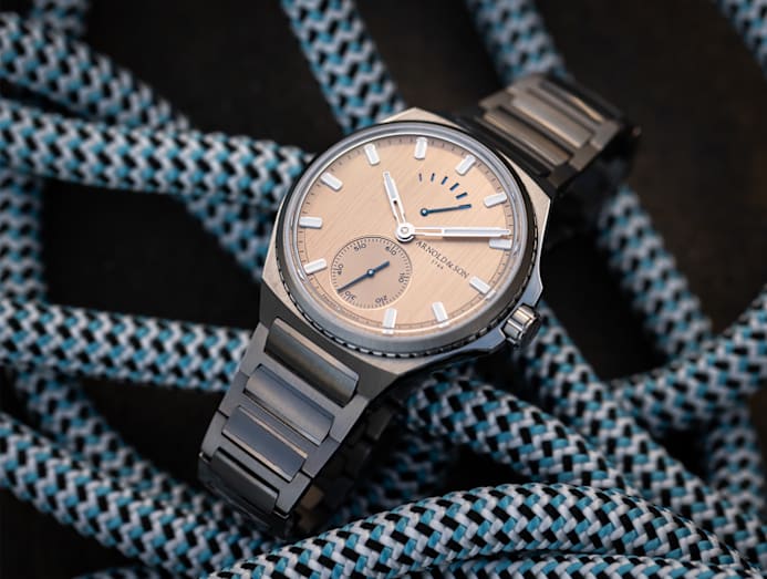 Founder tributes won’t be going anywhere anytime soon, but at least Arnold & Son’s approach keeps its homages very mindful of the present. The Longitude was named in honour of founder John Arnold’s marine chronometers from the 1760s and has plenty of nods to this nautical history: a power reserve indicator at 12 o’clock with a second subdial at 6, a notched bezel reminiscent of Arnold’s fluted chronometers, and a prow-shaped rotor in the COSC-certified A&S6302 calibre. But taken as a whole, it is still very much in keeping with the indefatigable trend of sports watches with integrated bracelets.