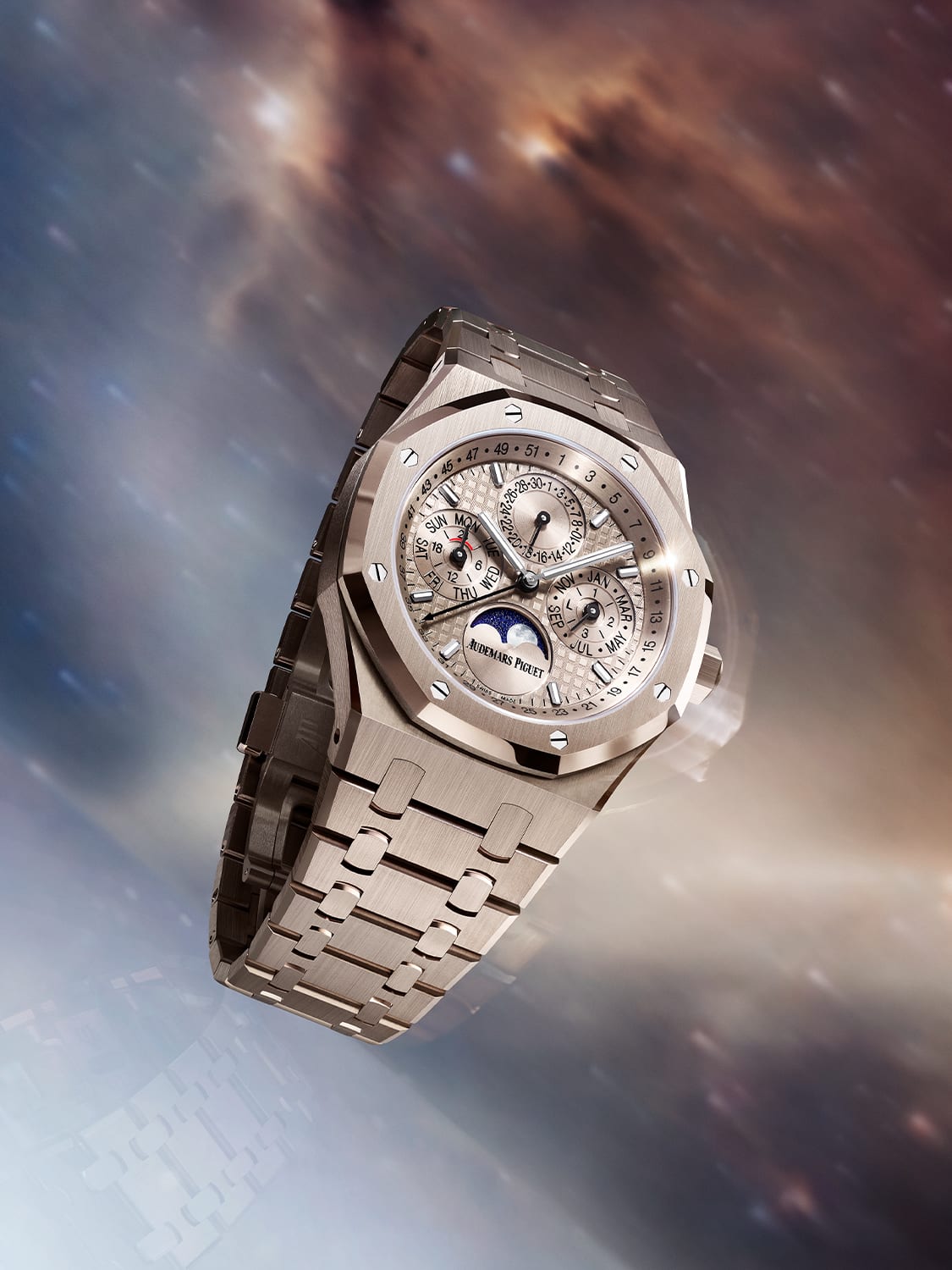 The result is a remarkably user-friendly perpetual calendar, with all functions adjustable via a single crown, housed in a case just 9.5mm thick. Among the new references, the standout is the Royal Oak in Sand Gold – Audemars Piguet’s proprietary alloy of gold, copper, and palladium. Both the Grande Tapisserie dial and snailed subdials share the same warm hue, achieved through galvanic treatment.
