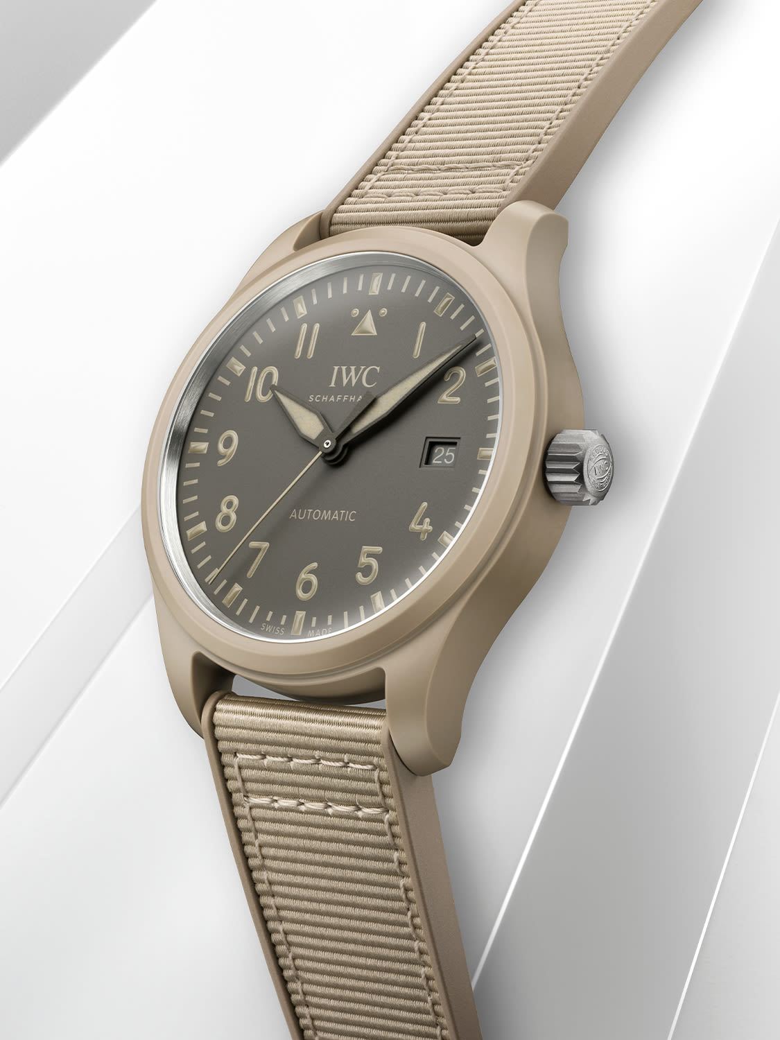 When you’ve gone through countless trials trying to get just the right shade of ceramic, it makes sense to want to use it on more than one watch. IWC’s “Mojave Desert” shade of high-tech ceramic first showed up in the mission-ready Pilot’s Watch Chronograph Top Gun Edition “Mojave Desert” in 2019, and has since reappeared in other Top Gun variations like the Big Pilot’s Watch, Big Pilot’s Watch Perpetual Calendar, and Pilot’s Watch Chronograph 41. This year, an uncomplicated automatic Pilot’s Watch joins the sandy crew.