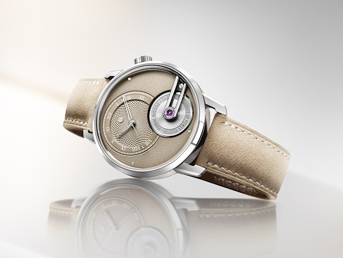 The main dial and off-centred time dial are the same colour, but contrasting finishes keep things visually arresting and legible: frosted for the former, and grain d’orge guilloche for the latter. Completing the look for this 38mm stainless steel watch is a matching Alcantara strap. Inside it, the in-house, manually wound Calibre AMW21 delivers 100 hours of power reserve.