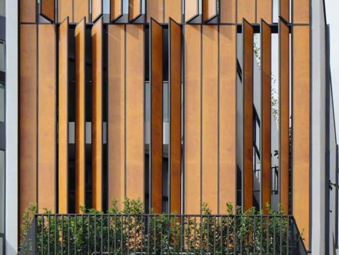 Large engineered timber brise soleil in a warm, copper finish defines the front facade. They rise up the second- to attic storeys, revealing little to the street. “The front facade is the only opening where there are opportunities for longer views and wind to enter the house,” highlighted Tiah.
