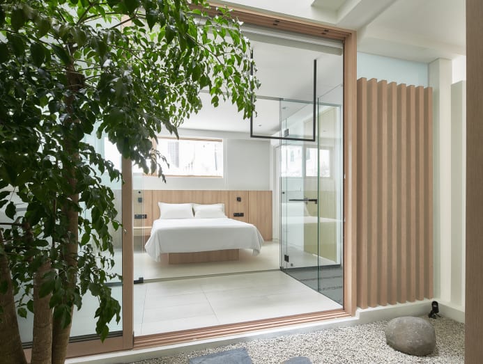 “The guestroom and bathroom’s transparency allows visual connection with the landscaped courtyard, enlarging the perception of space and crafting a private internal green enclave that can be enjoyed from many angles while the user is at rest or showering,” Wong elaborated. Retractable blinds take care of modesty when one is using the bathroom.