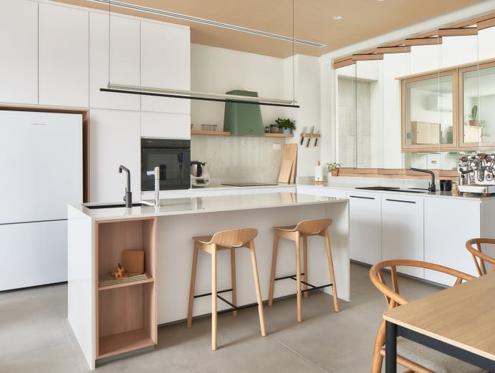 The family also enjoys how the living room segues into the kitchen, where they congregate to cook or dine around the kitchen island. “There is a herb garden and lemon tree on the terrace, making it convenient to pluck a lemon and make lemon water on a hot day, or cut some basil leaves to cook up a spicy Thai basil pork dish for lunch,” shared the husband.