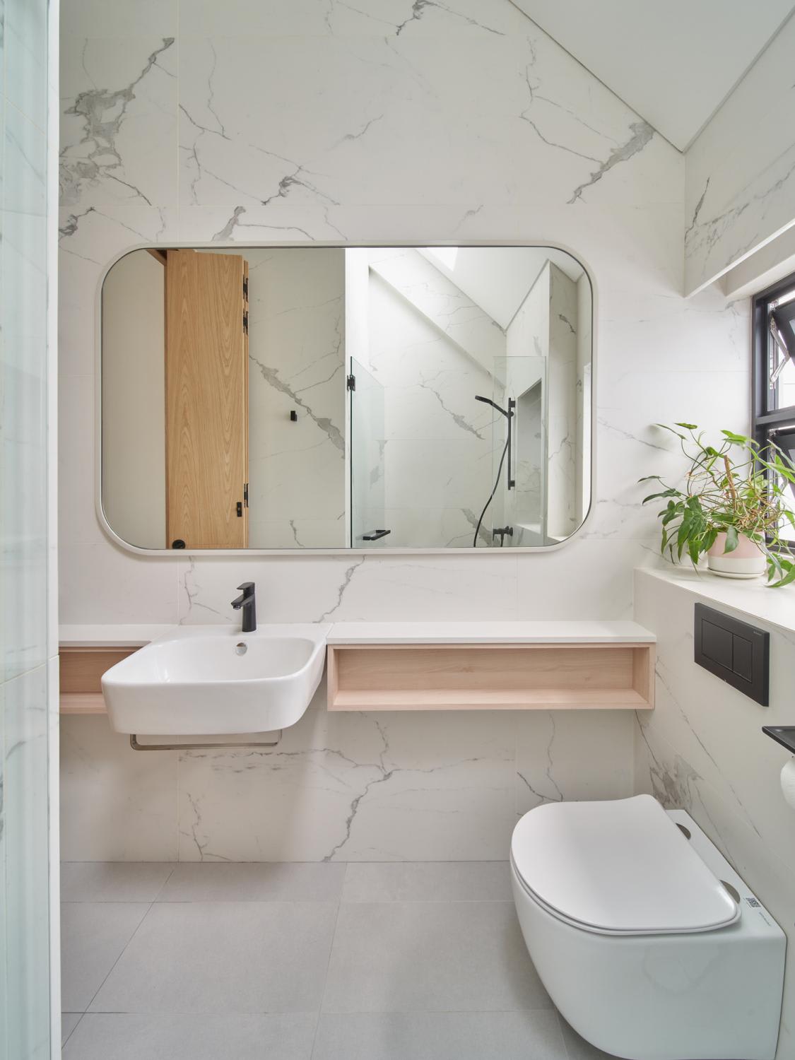 Aside from the first storey bathroom, the other bathrooms are also privy to outdoor views. “The children shower with the clouds, rain and sun coming in through a glass skylight in the ceilings. In the master bathroom, the freestanding bathtub is screened at body height with blinds integrated within a double-glazed window unit, where a glass panel frames the sky and shrubs in the planter,” highlighted Wong.
