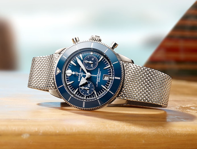 What it is: The SuperOcean Heritage B01 Chronograph is Breitling’s nod to its 1950s dive watches, mixing retro elegance with modern engineering. Sized at 42mm with a ceramic bezel and robust steel case, it’s as much a tool watch as it is a desk diver. Powering it is Breitling’s in-house B01 calibre – column wheel, vertical clutch, 70-hour power reserve, and COSC certification. The sunburst blue dial with panda registers makes it a looker both above and below water.