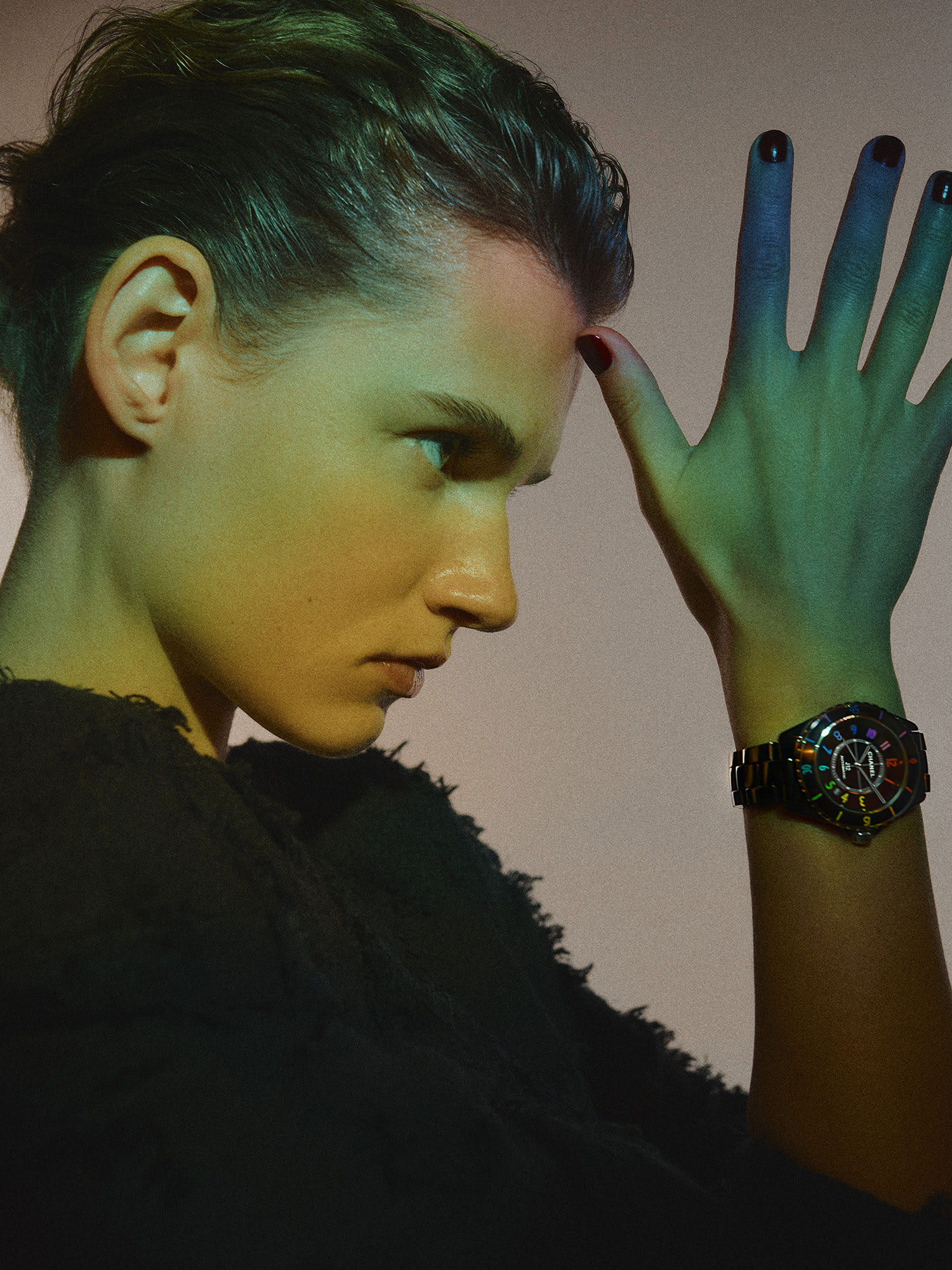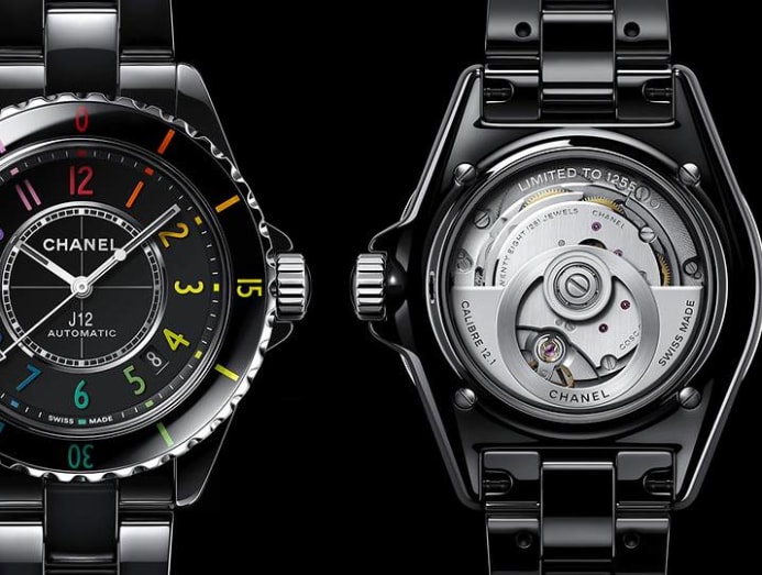 For 2021, Chanel's standard J12 design in smooth, shiny black ceramic gets just a wink of colour with graduated neon rainbow hour and bezel markers. (Photo: Chanel)