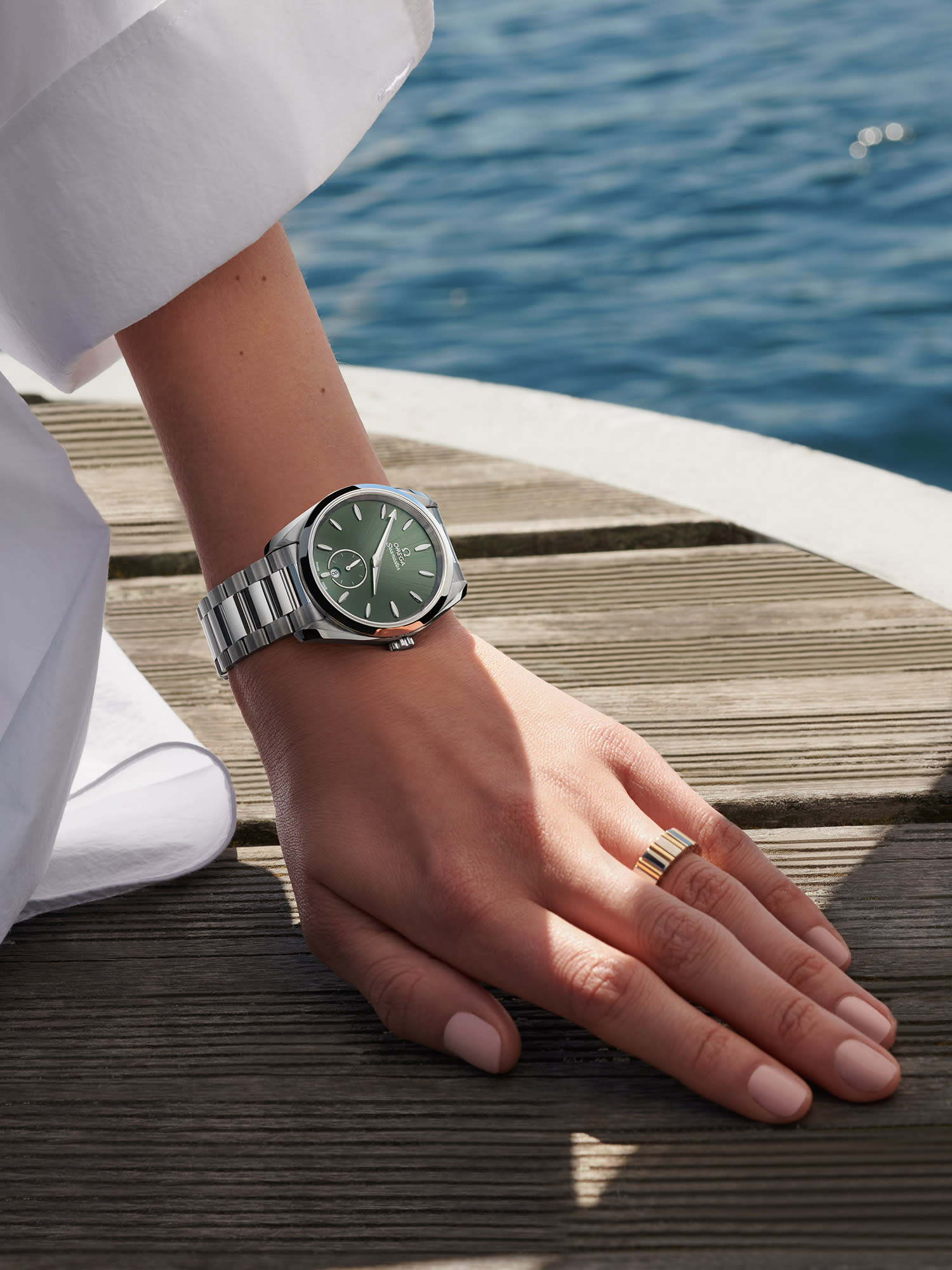 We are partial to the full steel version with the mother-of-pearl hour markers on a satin-brushed dark green dial for its easy elegance and on-trend colouring. Ticking away inside it is the Co-Axial Master Chronometer calibre 8802, which means it is not only highly precise but also resistant to magnetic fields reaching 15,000 gauss.