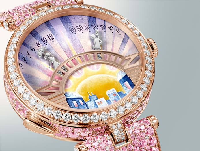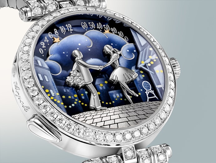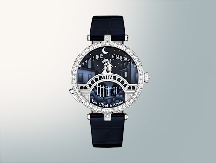 The watches are further brought to life by an array of time-honoured crafts. In the case of the Lady Arpels Pont des Amoureux watches, grisaille enamel, a technique first developed in 16th-century France, is used to create a chiaroscuro effect (contrast between light and dark), adding depth and beauty to the scene on the dial.