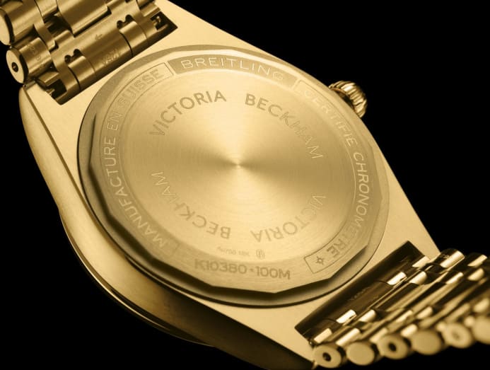 The collection features both the Breitling logo on the dial and Victoria Beckham’s initials on the seconds hand, with a choice of cases in stainless steel or yellow gold (limited to 100 pieces) – a material specially revived by Breitling for use in this line.