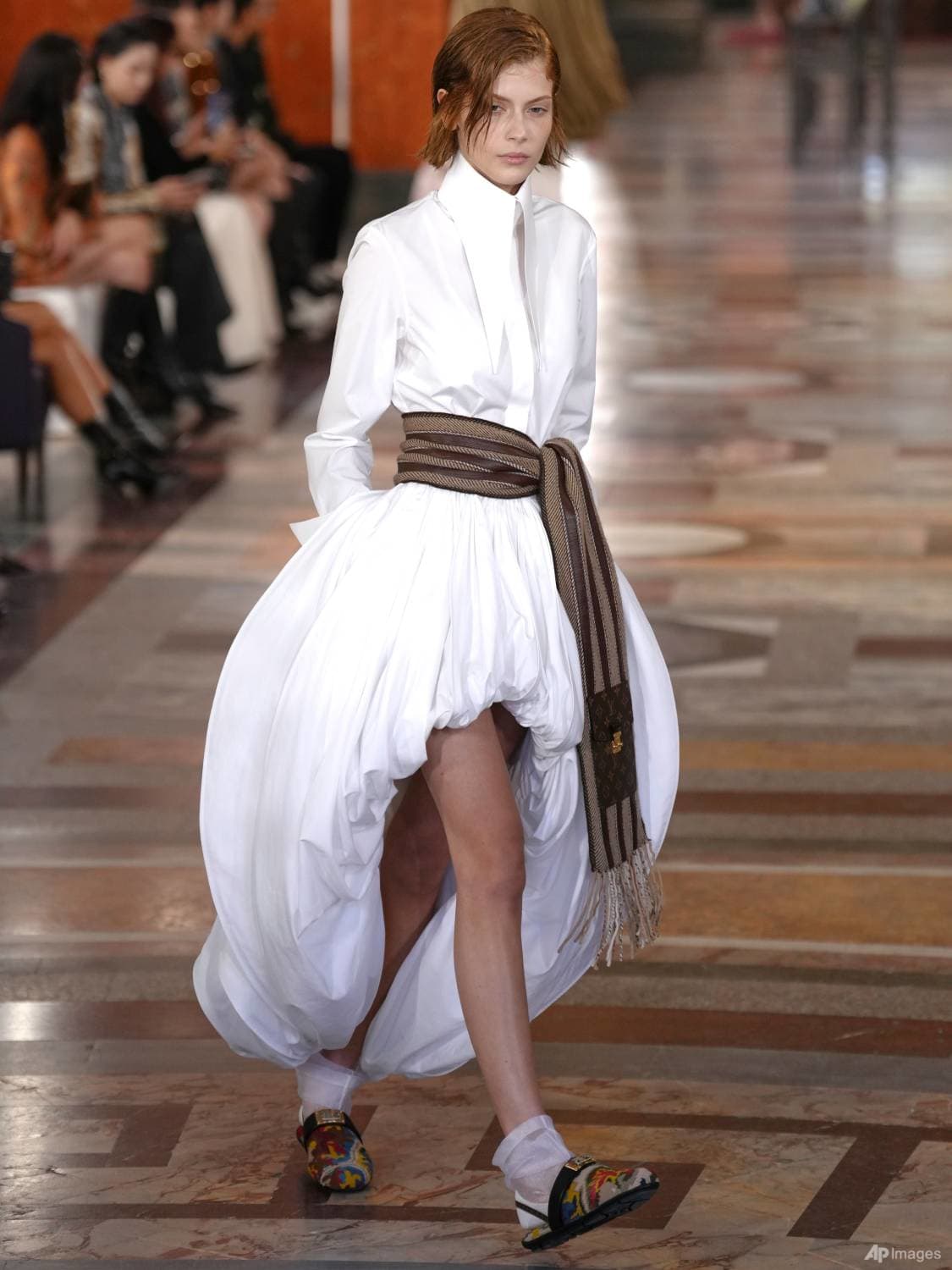 A model wears a creation as part of the Louis Vuitton Spring/Summer 2026 collection presented in Paris, Tuesday, Sept. 30, 2025. (AP Photo/Aurelien Morissard)