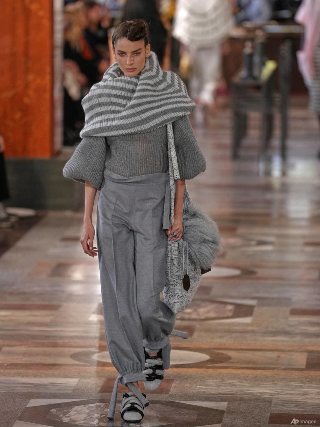 Inside gilded salons, with fall light pouring through 17th-century windows once used by Anne of Austria, Ghesquiere staged another jump through time. His Spring–Summer 2026 collection fused past and present, with corseted waists, Juliette sleeves, tubular arms, giant silk turbans. Feathered collars mimicked fur, while baggy, sultan-style trousers added an Eastern beat. A striped, ruffled coat winked like Pierrot as a bejeweled gown flashed back at the murals.