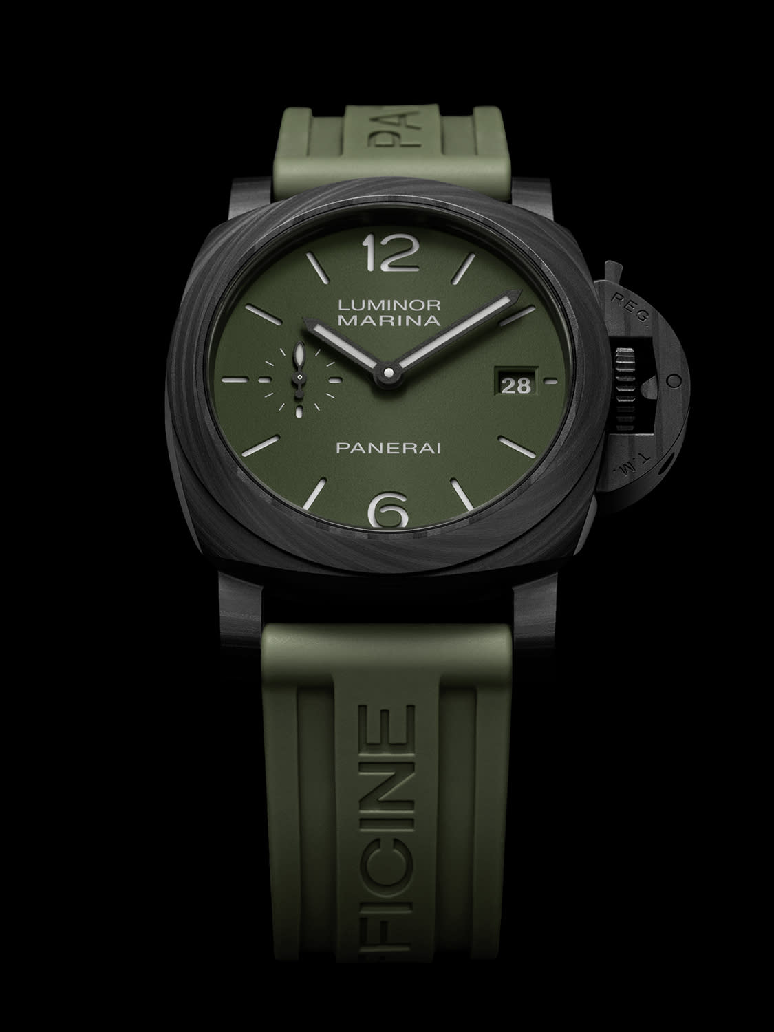 The latest Luminor Quaranta Carbotech PAM01526 sets a new benchmark in lightweight design and durability. For the first time, the Luminor Quaranta line features a model with a Carbotech case made from carbon fibres and technical polymer, making it 80 percent lighter than steel and 64 percent lighter than titanium. Weighing under 100g, each 40mm watch features a distinctive matte black surface shaped by the cutting of the material, which means no two pieces are alike. This is complemented by a striking matte green sandwich dial with glowing white Super-LumiNova X1.