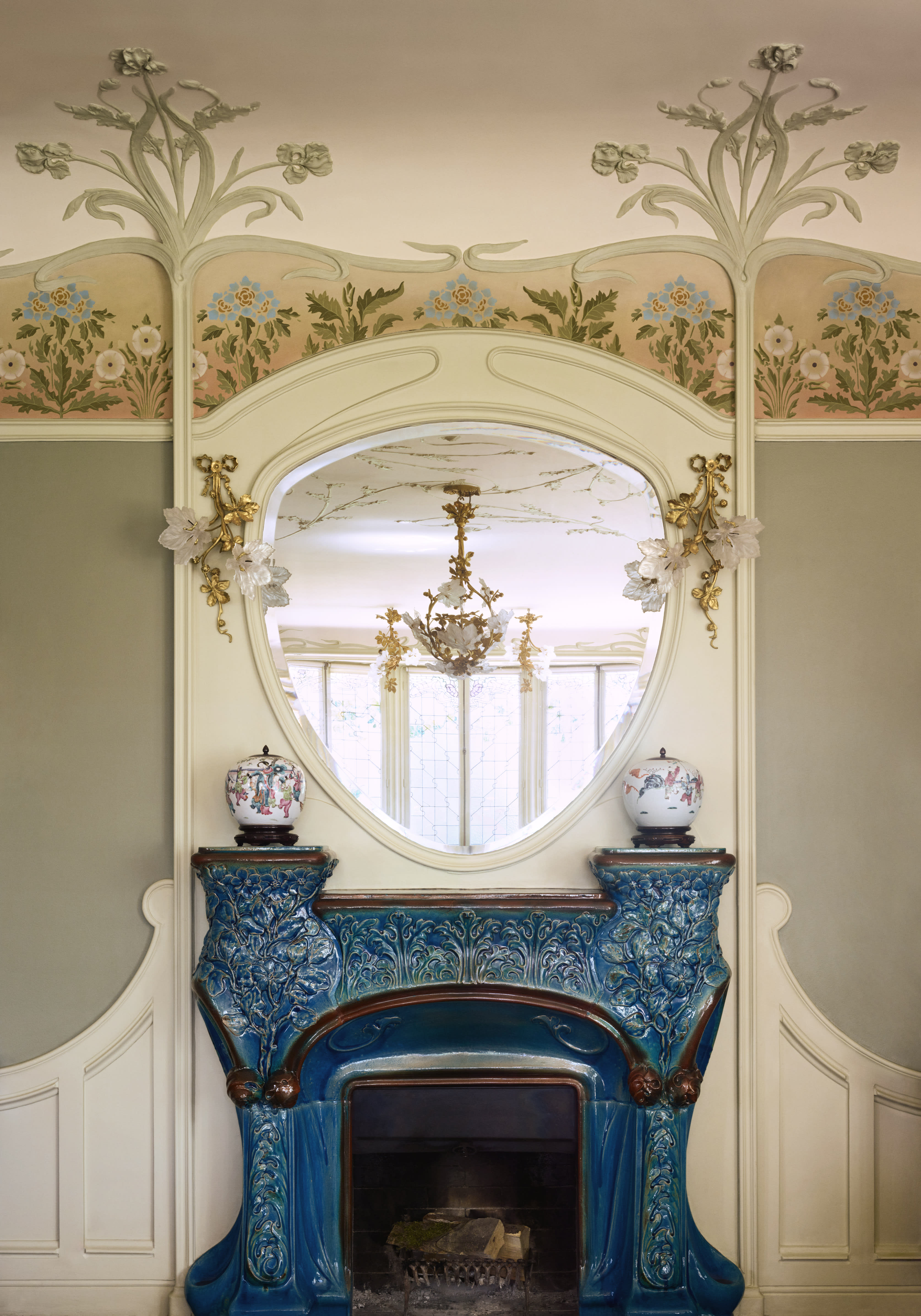 The living room dates back to 1900 and is an extension created by George, son of Louis Vuitton. It’s Art Nouveau in style and richer in terms of decoration, with ceiling mouldings, paintings, stained glass windows, a green ceramic fireplace with floral motifs, a bronze bust of Louis Vuitton, and one of Louis Vuitton’s earlier trunks in striped canvas, as a coffee table.