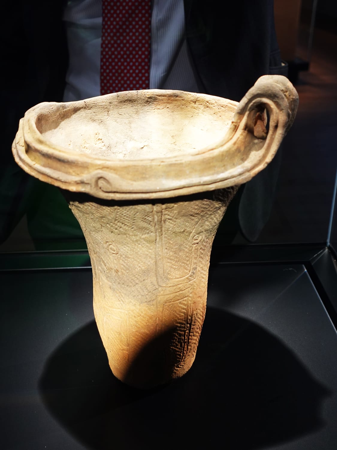 This large pottery vase with rudimentary cord markings was used to mix wine with water. The wine would then be served in smaller vessels.