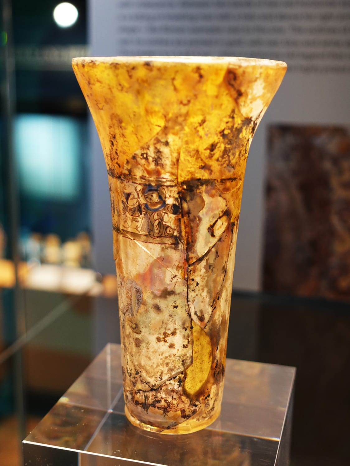The term ‘luck’ for a cup came from northern England and denoted exotic vessels which could possess talismanic powers. This comes from Syria, from around 1350, with decoration in red, white and blue enamel and gold enamelling. The image on the glass itself shows a man holding a conical glass, underlining the importance of drinking in Medieval times.