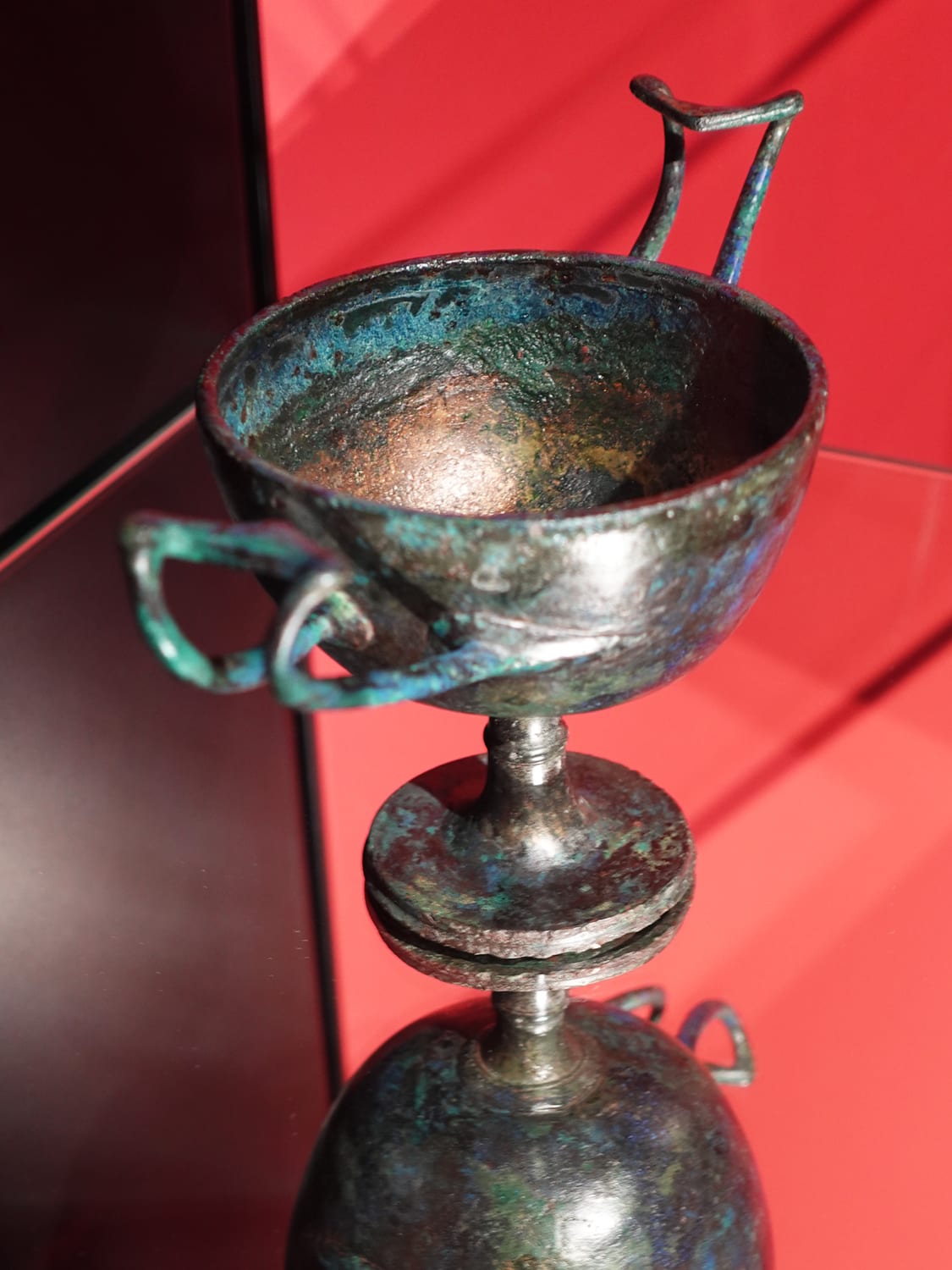 “This is a bronze from Alexander the Great (336 BC). When we restored it, we discovered mud inside it and in that mud we discovered gold. Remember, Alexander the Great was a big drinker. He murdered a friend of his in a drunken brawl at the age of 33, in part because of all that booze.”