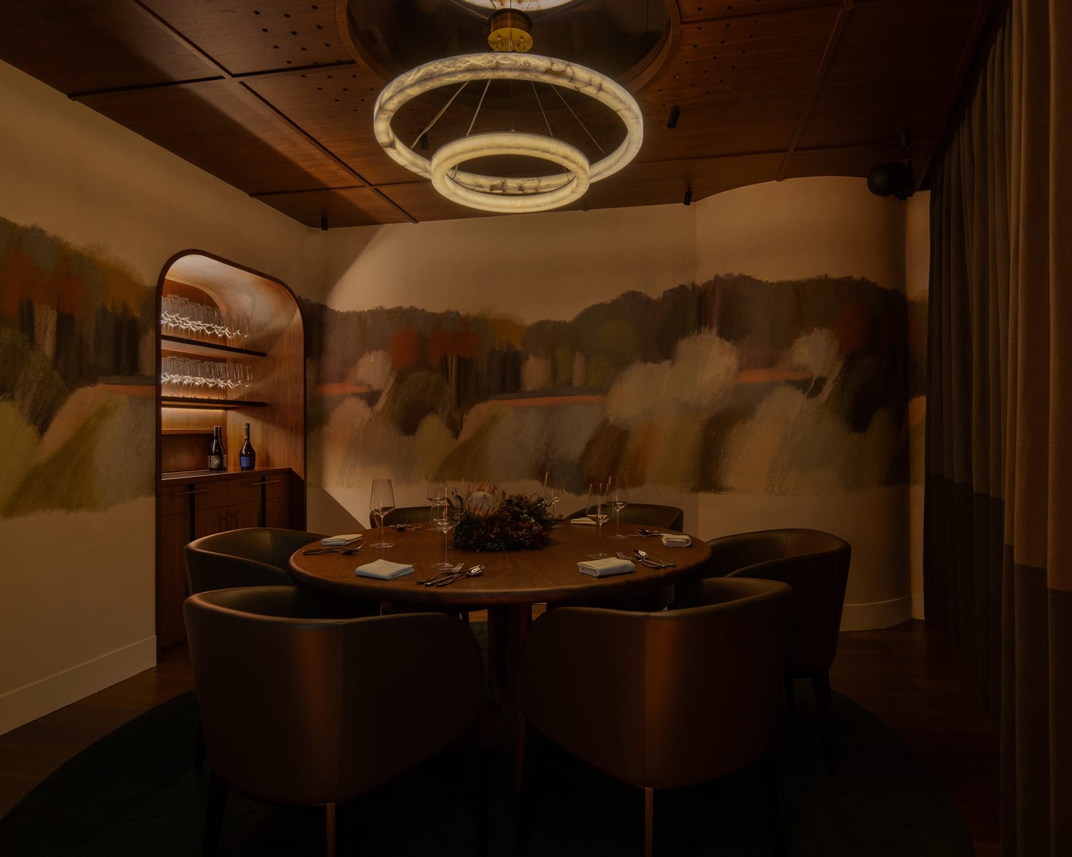 She described the soft ombre colour as evoking a Chilean desert sunset. In the private dining room, a panoramic wallpaper of Chilean mountains further reflects the cuisine. “We layered in as many links to their heritage and food as we could,” elaborated Maxwell.