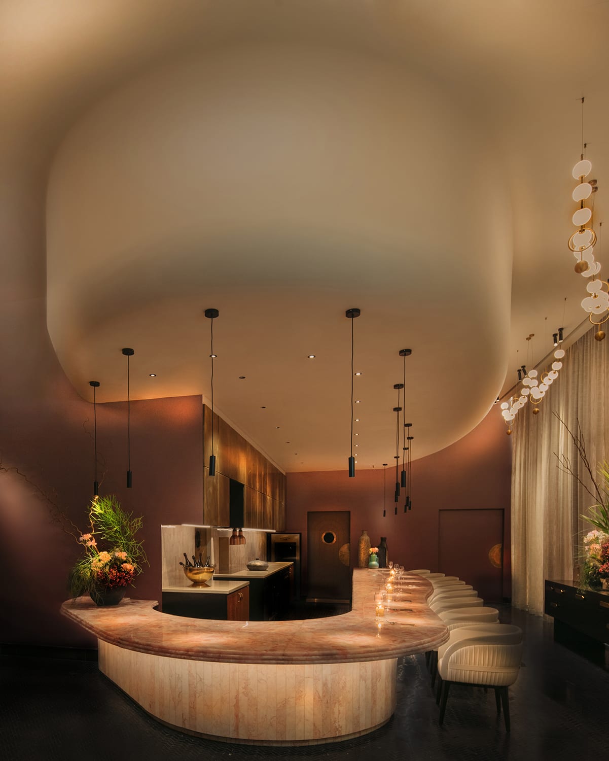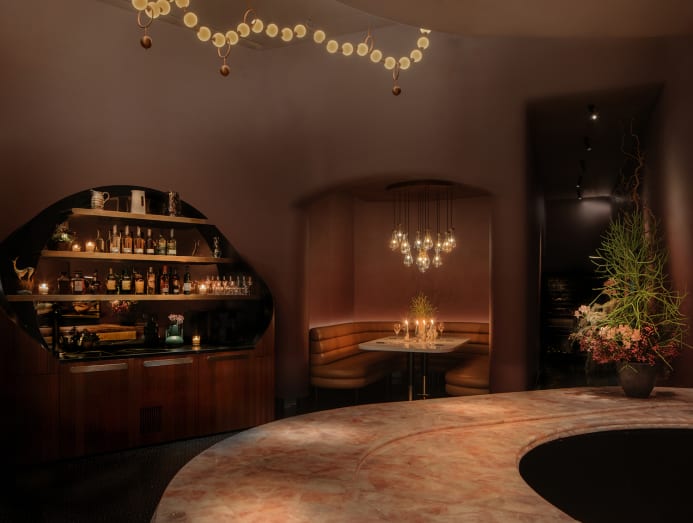 Rose quartz ended up being the main feature in Michelin-starred Chilean fine-dining restaurant, Araya, helmed by chefs Francisco Araya and Fernanda Guerrero. “When Araya came along, I knew where it belonged. We designed a 10m-long chef’s counter from a single slab of rose quartz. It runs the length of the space and sets the tone for everything around it; people respond to it instinctively. It’s also common in Chile where the chefs are from, so it felt grounded,” said Maxwell.