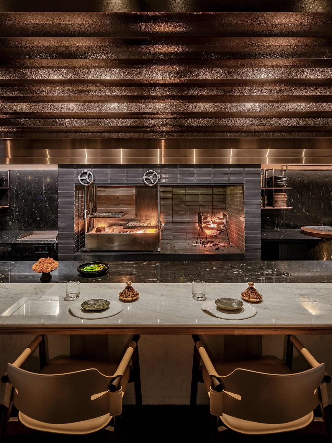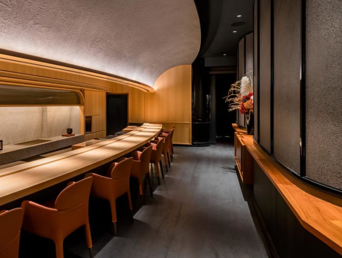 This sensibility for artisanal details as well as rich material exploration is palpable in striking spaces such as Revolver, Hamamoto, Yantra and most recently, modern izakaya bar Barood. In progressive Indian restaurant Revolver, a stepped beaten metal feature floats above the brick-clad grill station. In omakase restaurant Hamamoto a brushed hinoki wood counter – the only curved sushi counter in Singapore – arcs across the space. The use of hinoki wood pays homage to traditional Japanese restaurants, shared Shang. “The rest of the design itself is less traditional, with a sweeping arch above the open kitchen more of a theatrical-style presentation of the chef as the hero of the space. Next door at Revolver, a great hearth was created [to spotlight the fire used during grilling], showing its importance as a major part of the theatre of cooking, as well as highlighting the traditions of Indian cooking,” Shang elaborated.