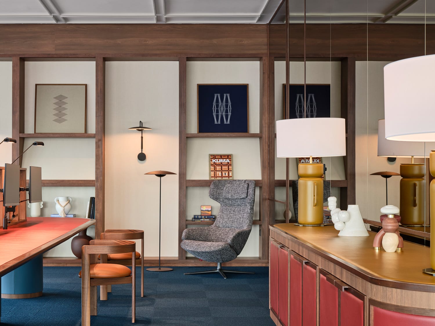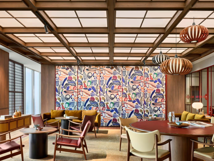Similarly in the office of commercial real estate company Cushman & Wakefield at Capital Spring, meeting rooms opening to internal ‘verandahs’ highlight the views from the 47th floor. The expansive vistas are countered by the intimate ambience, filled with natural light, warm materials, artwork, curated furniture, decorative lamps and object d’art on timber-framed shelves.