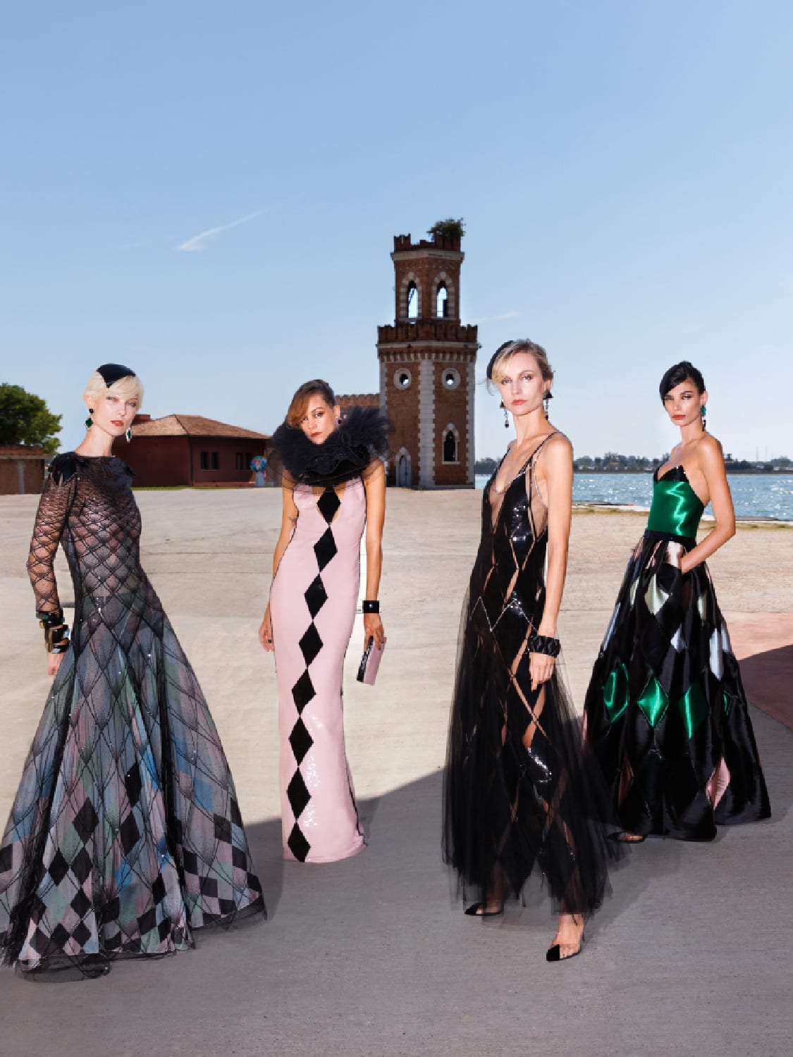 Armani’s designs have evolved over the decades. The Venetian catwalk shimmered with black headpieces and ruffled harlequin-like collars, sequinned lozenge-patterned dresses, tops and trousers in a variety of unconventional colours.