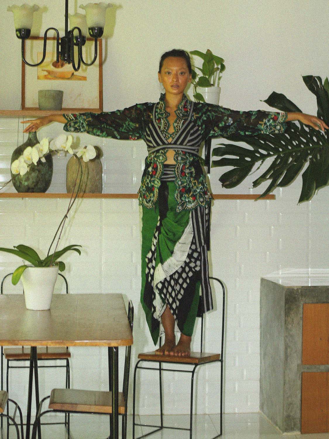 Asmara Abigail, one of Labibi’s renowned and loyal customers, first met him in 2017. “The first Lulu Lutfi Labibi piece I wore was a kimono-style floral outer,” shared Abigail, a famous model, actress, and a three-time Best Supporting Actress nominee at the Indonesian Film Festival. “When I wear a Lulu Lutfi Labibi, I feel a liberty to express myself. I have the freedom to be wild, to be elegant, to be vulnerable, to be a laughing stock, to be proud of my achievements, to be brokenhearted, to stand back up, to choose my destiny, and not to fear being on my own.”
