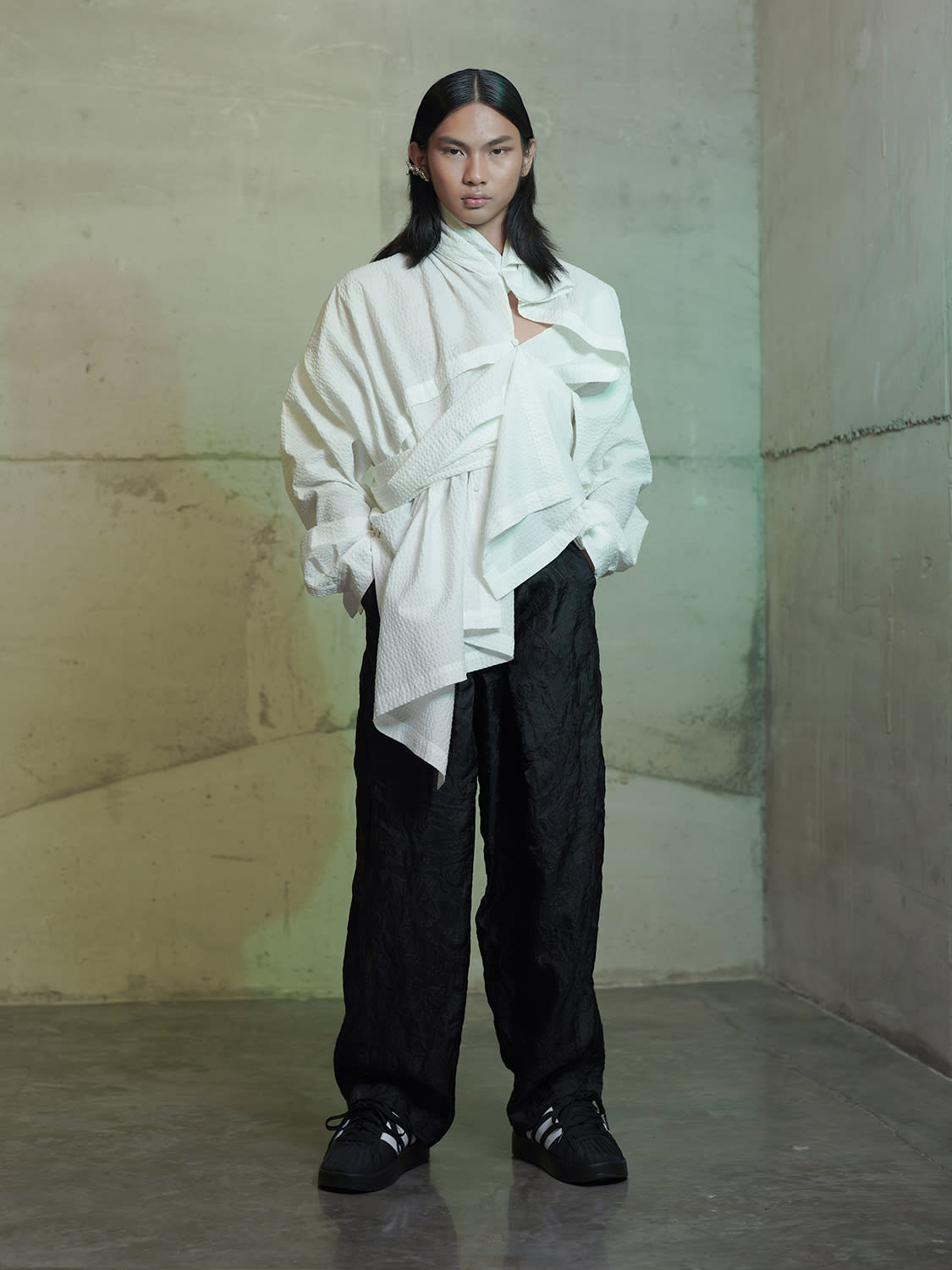 As usual, there is no women’s or men’s collection in Lulu Lutfi Labibi, every series is designed for all genders. It is interesting to see that the glamorous jacquard bolero is worn on both male and female models. The fluidity is matched with Yogyakarta’s laid-back spirit, with Labibi describing his wearers as people who are “comfortable in their own skin, relaxed, know themselves well, and usually prefer sandals or to be barefoot than to wear dress shoes.”