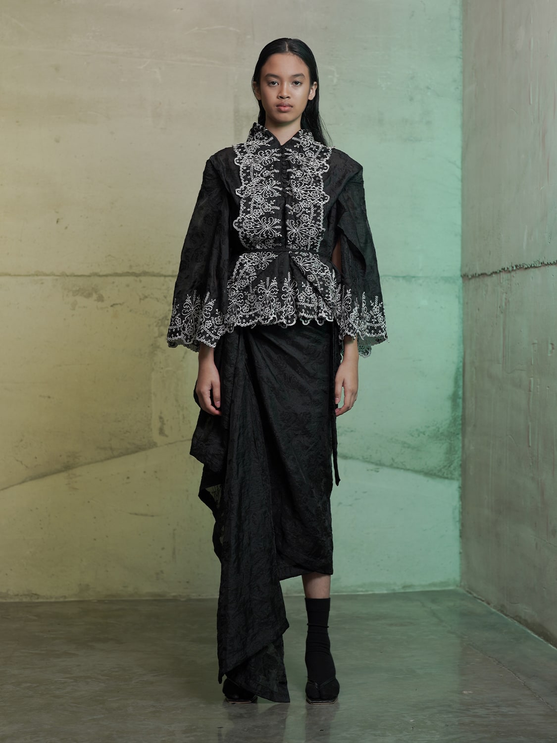 With this in mind, he designed Kala, his 2025 collection. The collection has a lot of monochromes, a classic that highlights the motifs (florals, baroque, and graphics), as well as the fabric textures (jacquard, chiffon, cotton). The use of jacquard with baroque graphics reflects Labibi’s ode to his longtime idol, Belgian designer Dries van Noten.