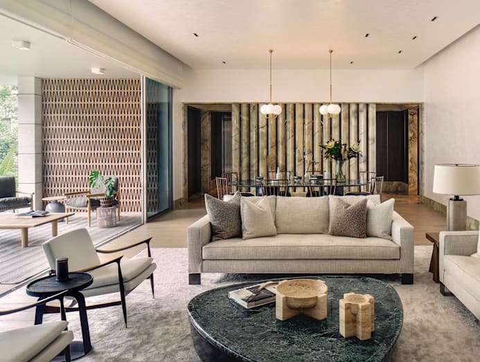 For a home at Nassim Park Residences, a dozen marble columns in Jade Green Marble Onyx, sourced from Pakistan, were designed as a sculptural backdrop for the dining and living spaces, while doubling as a partition from the foyer.